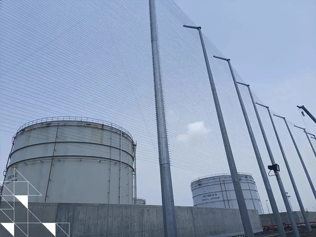 صيانة سهلة وأمان هيكلي: تبدأ الشبكة من ارتفاع 2.5 متر لتسهيل الحركة والصيانة الأرضية. كما أن النظام مزود بأسلاك توجيهية تضمن سقوط السياج للخارج في حالة الصدمات العنيفة، حمايةً للمنشأة.